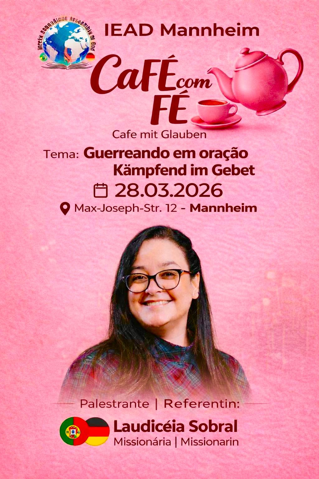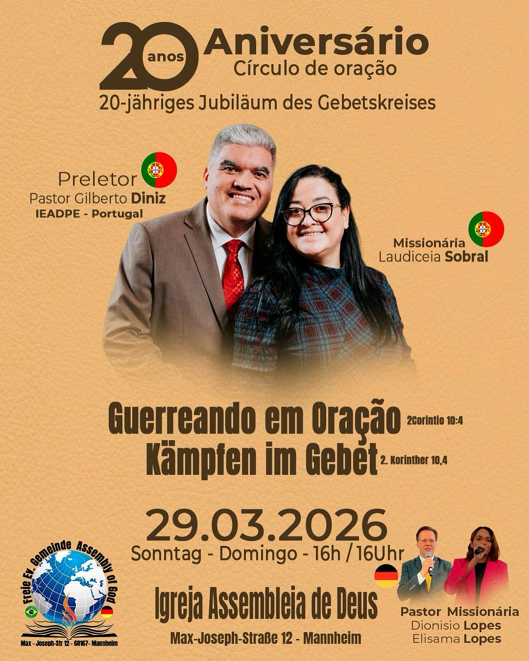 Os cultos são ministrados em portugues com tradução simultanea para alemão.